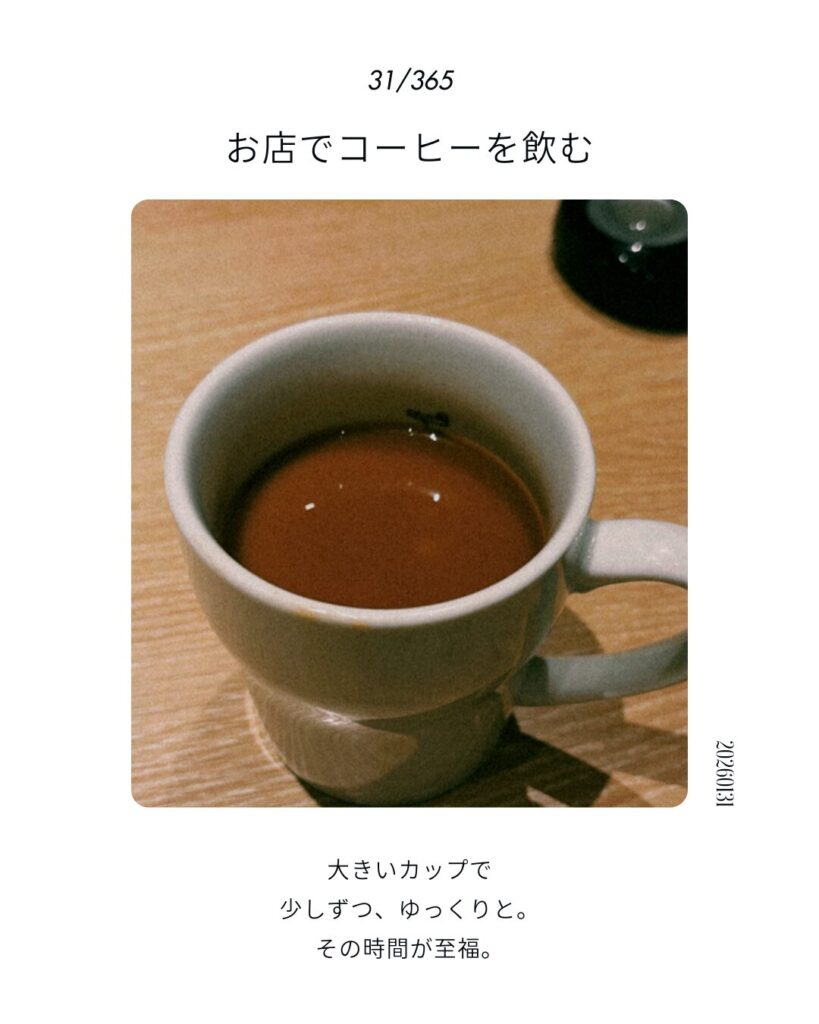 31/365「お店でコーヒーを飲む」 日々を編む 2026/1/312026/2/1 #365日の作業帖#作業の記録#作業療法からみた暮らし#暮らしの記録#今日もお疲れさま ▼関連記事 1日1投稿、はじめます。