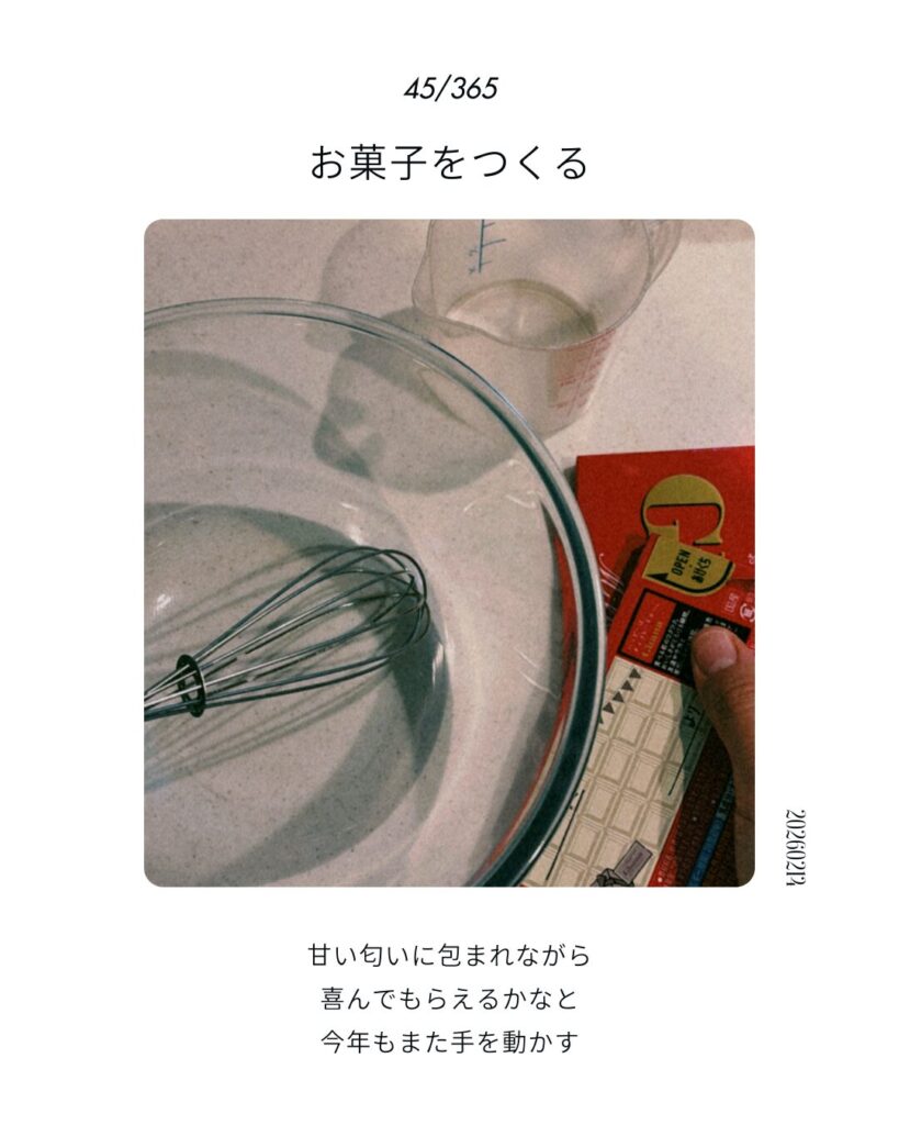 45/365「お菓子をつくる」 日々を編む 2026/2/14 #365日の作業帖#作業の記録#作業療法からみた暮らし#暮らしの記録#今日もお疲れさま ▼関連記事1日1投稿、はじめます。 1月の作業帖「看病する」という作業が教えてくれたこと